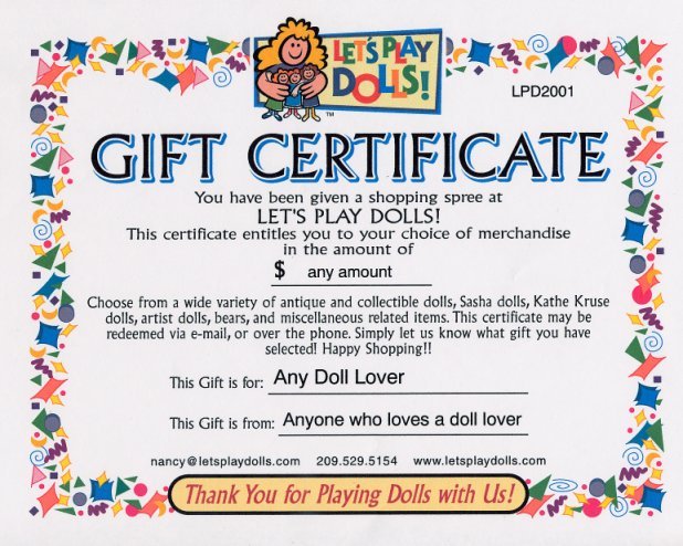 Here is the perfect gift for the doll lover in your life! You know she will love it, because she will choose it. Gift certificates are available in any denomination. There is no expiration date, so she will have all the time she needs to select her special doll, bear or related item! Satisfaction is guaranteed. Gift selections are exchangeable for replacement gift, or merchandise credit, within 5 days of receipt. Not redeemable for cash. Please specify certificate amount, name of recipient and name of giver. The order may be placed via our Order Form, e-mail or over the phone.Certificates may be delivered via e-mail as an attachment (in PDF format), as a hard copy via "snail mail," or both. Please specify your preference. |